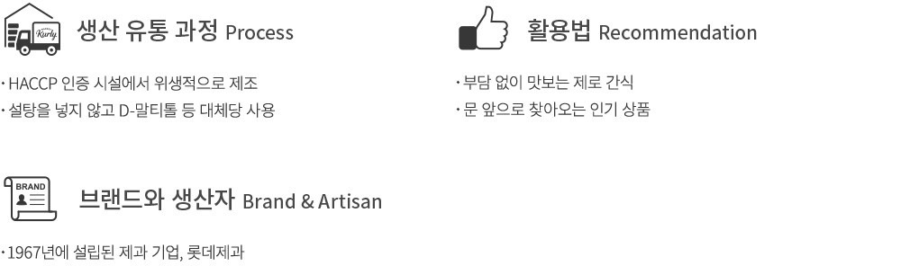 세대를 뛰어넘어 오랜 기간 사랑받아 온 제과 브랜드,롯데제과가 이번에는 당류 걱정 없이 즐길 수 있는 간식을 선보입니다. 당 섭취를 줄이기 위한 ‘제로’ 프로젝트의 일환으로,설탕 대신 대체 감미료로 단맛을 내었는데요. 지금 소개하는 제품은 바삭한 카카오 쿠키 사이에 바닐라 크림을 샌드해 완성한 과자예요. 설탕은 사용하지 않았지만,진한 달콤함만큼은 놓치지 않았답니다. 마음의 부담을 덜어 줄 롯데제과의 제로 간식을 컬리에서 만나 보세요.