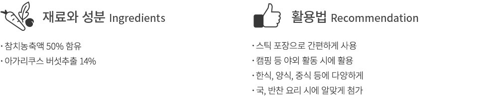 요리의 맛을 완성하는 비결로,서림식품의 진 참치액을 즐겨 찾는 분들 많으실 텐데요. 간편하게 보관하고 활용할 수 있도록,이번에는 진 참치액 스틱을 준비했어요. 참치농축액 50%와 아가리쿠스 버섯추출물 14% 등을 진하게 담아 만들었답니다. 한 번에 쓰기 좋은 양만큼 한 팩으로 개별 포장되어 있어 야외 활동 시에도 유용할 거예요. 국이나 반찬 등의 요리에 더해,깊은 맛을 간단하게 끌어 올려 보세요.