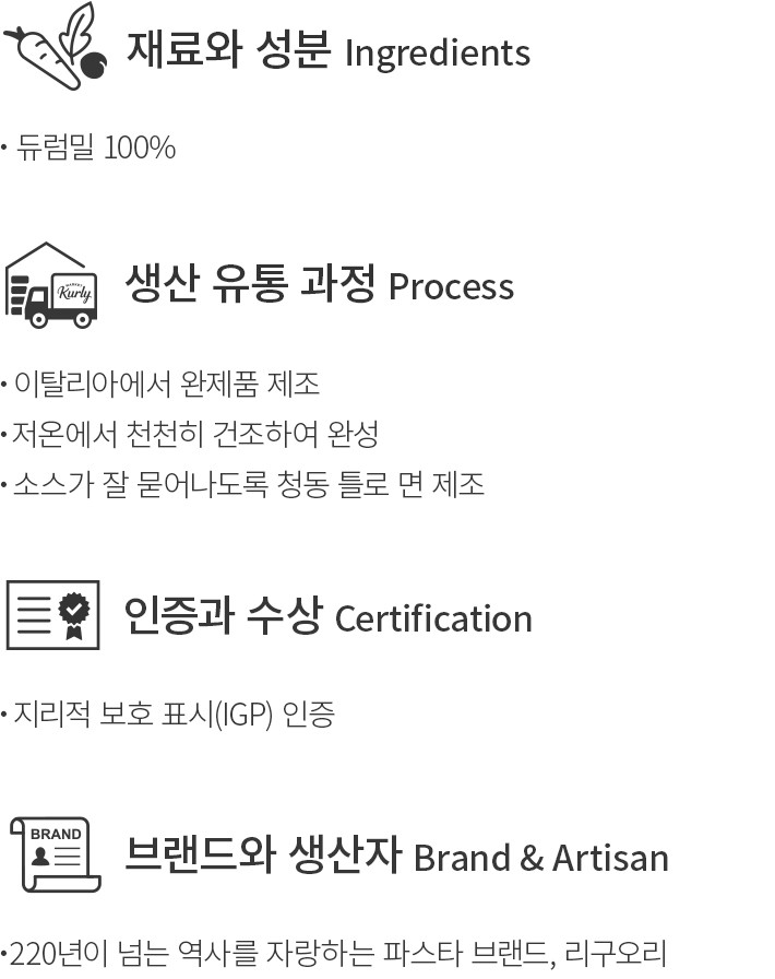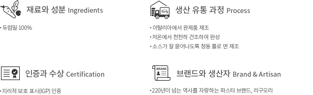 | 안내사항 | IGP인증은 그라냐노의 엄격한 가공방법과 생산규칙을 준수하는 역사를 인정합니다. 파스타면의 IGP인증은 의미가 매우 큽니다. IGP인증은 이탈리아산 듀럼밀을 사용하며,브론즈압출 방식,표준화된 건조방식 등으로 세계적으로 인증 받은 제품입니다. |