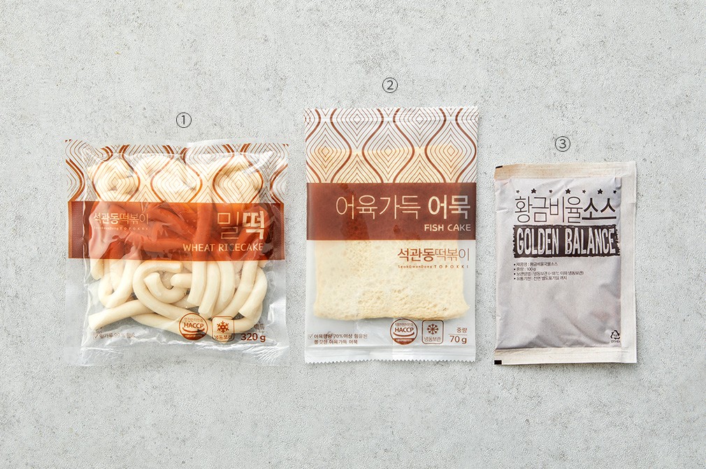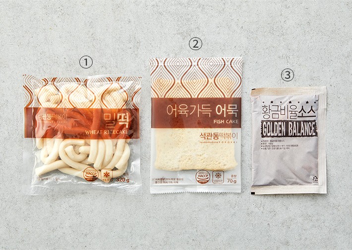 국물 떡볶이?구성:①밀떡(320g),②부산어묵(70g / 35g X 2장),③황금비율 소스(100g)