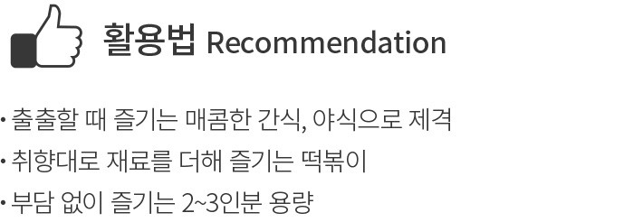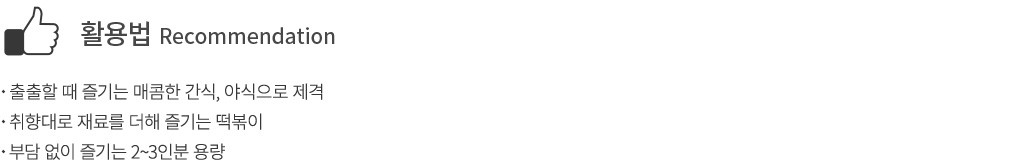 알레르기정보 | - 떡,어묵:밀,대두 함유 (새우,오징어,땅콩,우유,달걀,게를 사용한 제품과 같은 제조시설에서 제조) - 소스:밀,대두,쇠고기,우유,새우,조개류 함유(알류,메밀,땅콩,고등어,게,돼지고기,복숭아,토마토,닭고기,호두,오징어,아황산류를 사용한 제품과 같은 제조시설에서 제조 |
