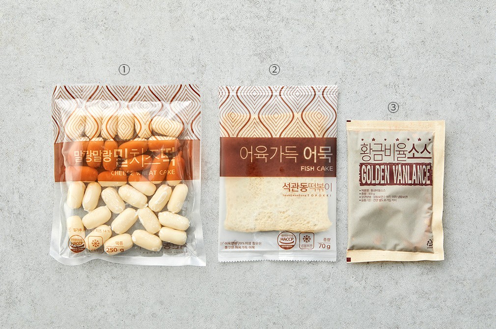 치즈 쭈욱 떡볶이・구성:①밀 치즈떡(250g),②부산어묵(70g / 35g X 2장),③황금비율 소스(100g)