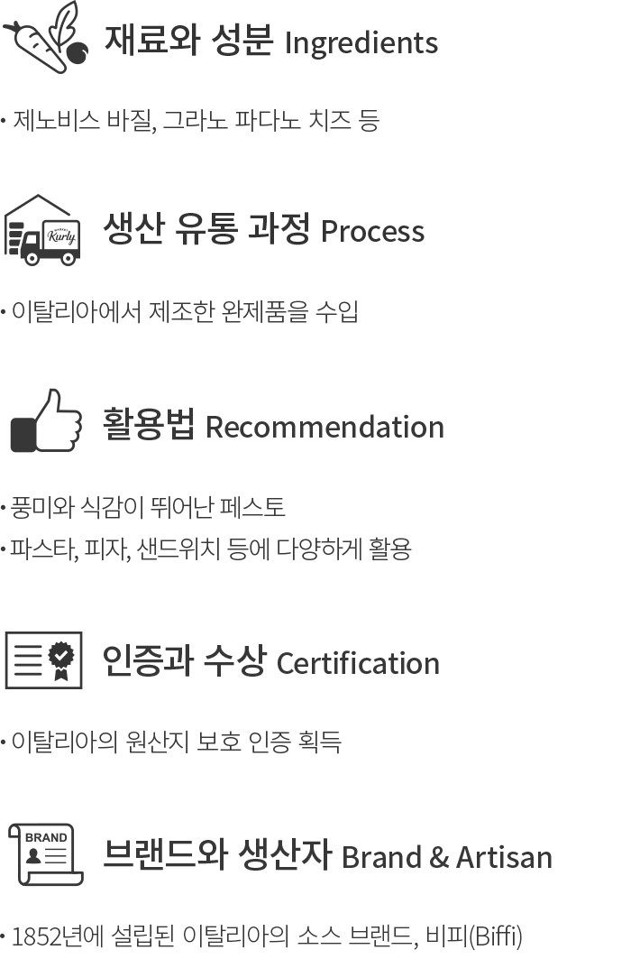 이탈리아의 D.O.P 인증은 지정된 지역 안에서 생산된 제품을 인증하는 표시로,지역 제품을 보호하고 차별성을 부여하기 위해 사용되는데요. D.O.P 인증을 획득한 비피의 바질 페스토는 바질과 그라노 파다노 치즈,잣 등을 곱게 갈아 만든 페스토예요. 170년 이상의 역사를 가진 브랜드에서 만든 페스토답게,바질 본연의 향긋한 풍미가 제대로 살아있답니다. 냉장고에 보관해두었다가 카프레제 샐러드에 곁들이거나 파스타,피자로 요리하는 등 취향에 따라 다양하게 활용해 보세요.