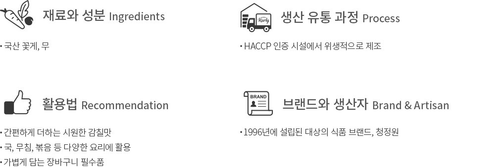 한식 요리에 감칠맛을 더해줄 청정원의 꽃게참치액을 만나보세요. 훈연참치를 저온추출공법으로 은근하게 우려 완성했어요. 여기에 국산 꽃게와 무로 시원하고 깔끔한 맛을 더했답니다. 깊고 풍부한 감칠맛이 필요한 국이나 무침,볶음요리 등에 다양하게 활용하기 좋죠. 마트에 일부러 나가지 않아도 집에서 편하게 즐길 수 있도록 준비했으니,장바구니에 쏙 담아보세요.