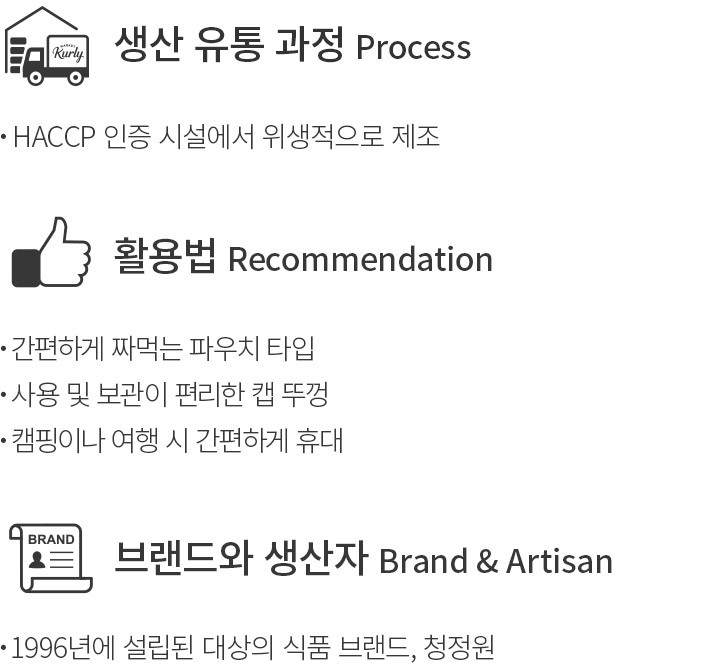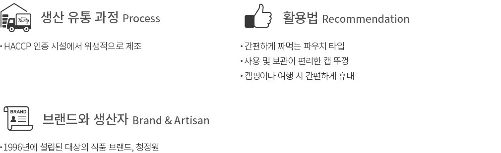 고소한 쌈장에 청양초로 매콤한 맛을 살린 청정원의 순창 청양초쌈장을 소개할게요. 참깨,마늘 등 갖은 양념에 사과와 매실로 달짝지근한 감칠맛을 더했어요. 고기 요리부터 쌈 채소까지 두루두루 잘 어울린답니다. 간편하게 먹기 좋도록 파우치에 담아냈는데요. 숟가락 없이 그릇에 바로 쭉 짜면 되니 깔끔하고 편리하죠. 캠핑이나 여행 시에 간편하게 챙겨가기도 좋을 거예요.