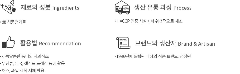 새콤달콤한 풍미로 음식의 맛을 끌어올려 주는 사과 식초,청정원으로 만나보세요. 주정이나 향료를 넣지 않고 오직 사과와 물만 담아 더욱 믿음직스러워요. 100%의 사과농축액을 3단 발효공법으로 발효시켜,사과 본연의 상큼한 풍미와 깊은 단맛을 고스란히 느낄 수 있어요. 샐러드 드레싱을 만들 때나 무침류의 새콤함을 끌어올릴 때 활용해 보세요.