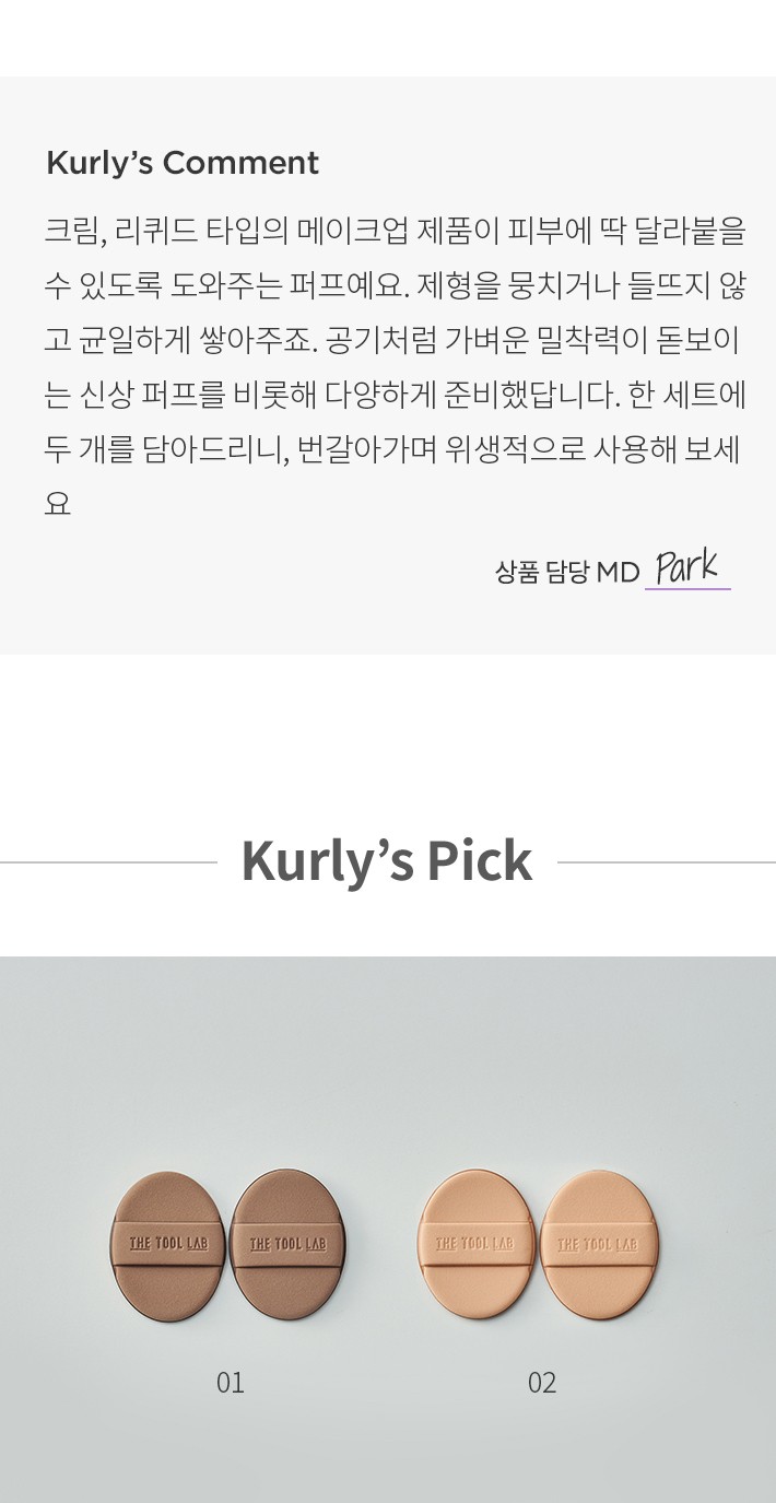 ・특징:5겹 메모리폼 소재로 완벽한 커버를 도와주는 퍼프입니다. 수분 부족형 지성이나 건성 피부에 추천해요.