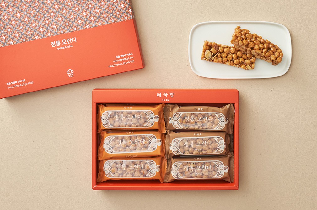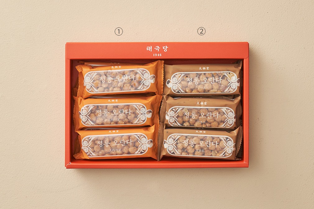광복 이후 1946년,해방을 꿈꿨던 민족의 이상을 담아 세운 빵집 ‘태극당’. 오랜 역사 속에서 한결같은 전통과 맛을 지켜온 태극당의 베이커리를 선물세트로 만나보세요. 이번에는 추억의 간식인 오란다를 준비했어요. 국산 멥쌀,찹쌀 등을 넣어 만든 쌀알알이에 유기농 쌀조청을 버무려 완성했답니다. 쫀득하고 꾸덕한 식감과 은은한 단맛이 매력적이죠. 오리지날과 아몬드 2가지를 한데 담아 보내드리니 소중한 분들께 건네는 선물로 선택해 보세요.