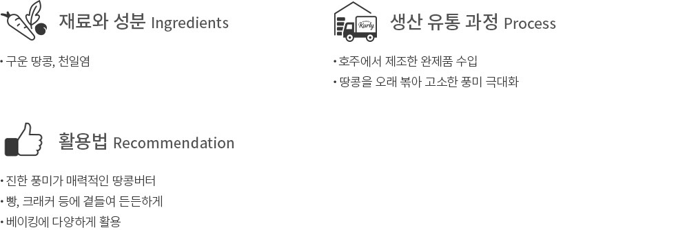 ・특징:부드럽고 매끈한 질감과 함께 다크로스트로 볶아낸 땅콩의 고소한 풍미가 진하게 느껴져요.