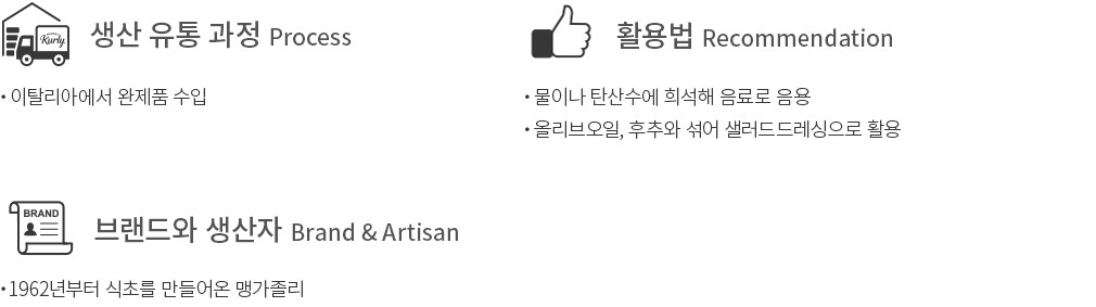 1962년부터 식초를 만들어온 맹가졸리는 통나무에서 식초를 발효시키는 전통 기법에 최신 기술을 접목한 이탈리아 회사입니다. 발효 시 알코올과 와인을 통과시키는 공정을 반복하여 숙성하므로 마일드한 산미와 향이 깊은 식초가 만들어지지요. 식초의 품질을 한 단계 높인 회사로 평가받고 있어요.