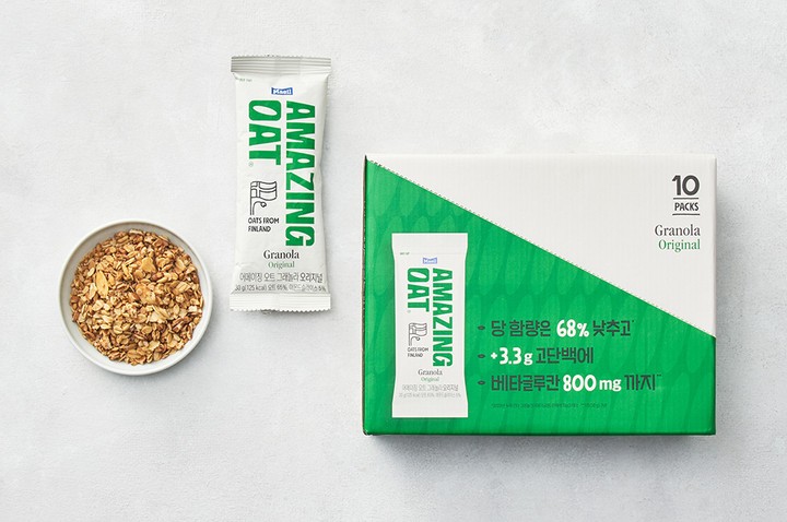 당 함량은 낮추고 달콤함은 그대로 남긴 어메이징 오트 그래놀라를 소개할게요. 아담한 파우치 안에 핀란드산 귀리를 가득 담아냈죠. 오트 플레이크와 로스팅 오트,오트 퍼프까지 세 가지 식감의 귀리를 담아내 끝까지 바삭바삭하게 즐길 수 있어요. 아몬드 슬라이스와 함께 오븐에서 구워낸 덕에 한층 더 고소하답니다. 한 포에 3.3g의 단백질이 들어있으니,요거트나 샐러드에 곁들여 건강한 한 끼를 즐겨보세요.