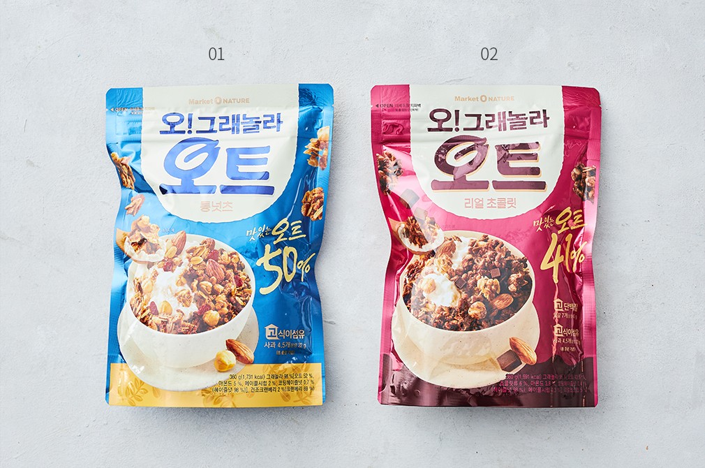 든든한 고식이섬유 시리얼,마켓오네이처의 오! 그래놀라 오트를 만나 보세요. 캐나다산 귀리 플레이크와 롤드오트를 베이스로 완성한 그래놀라입니다. 고소한 퍼핑 오트와 부드러운 퀵 오트,바삭한 크리스피 오트 등을 알맞게 블렌딩하여 다채로운 식감을 완성했어요. 통넛츠 맛은 아몬드,헤이즐넛 등의 견과류를 넣어 고소한 매력을 더했고,리얼 초콜릿 맛은 한층 더 달콤하게 완성했지요. 우유나 요거트를 곁들여 간단한 아침,든든한 간식으로 즐겨 보세요.