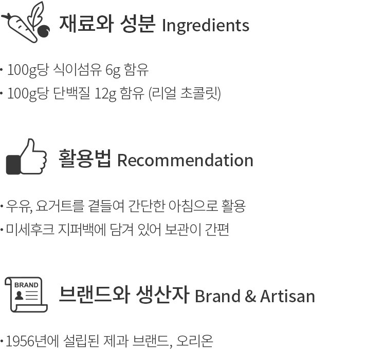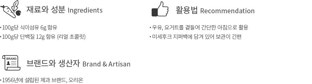 ・특징:밀크 초콜릿과 코코아 분말,아몬드를 더해 만든 그래놀라입니다. 단백질과 식이섬유를 풍부하게 함유하고 있어요.