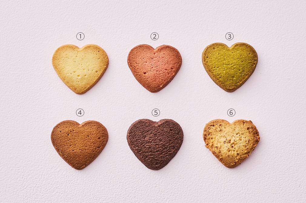 사르르 버터쿠키 세트・구성 :①사르르 플레인,②사르르 딸기복분자,③녹차 쿠키,④사르르 커피,⑤리얼 초코쿠키,⑥아몬드 쿠키