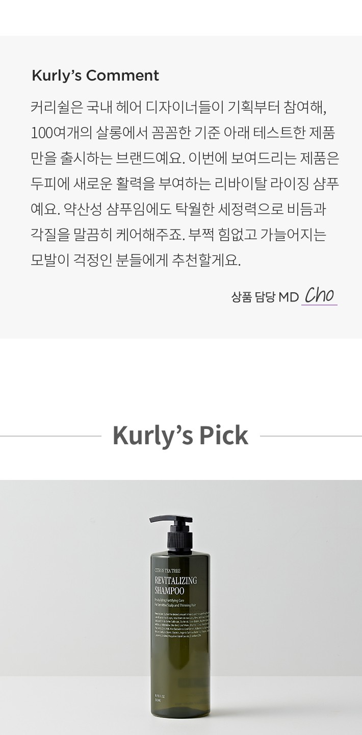 ・ 특징:시트러스계열 에센셜 오일과 티트리 성분을 함유하고 있어,두피에 새로운 활력을 부여하는 샴푸입니다. 힘 없는 모근과 약해진 모발을 케어해줘요.
