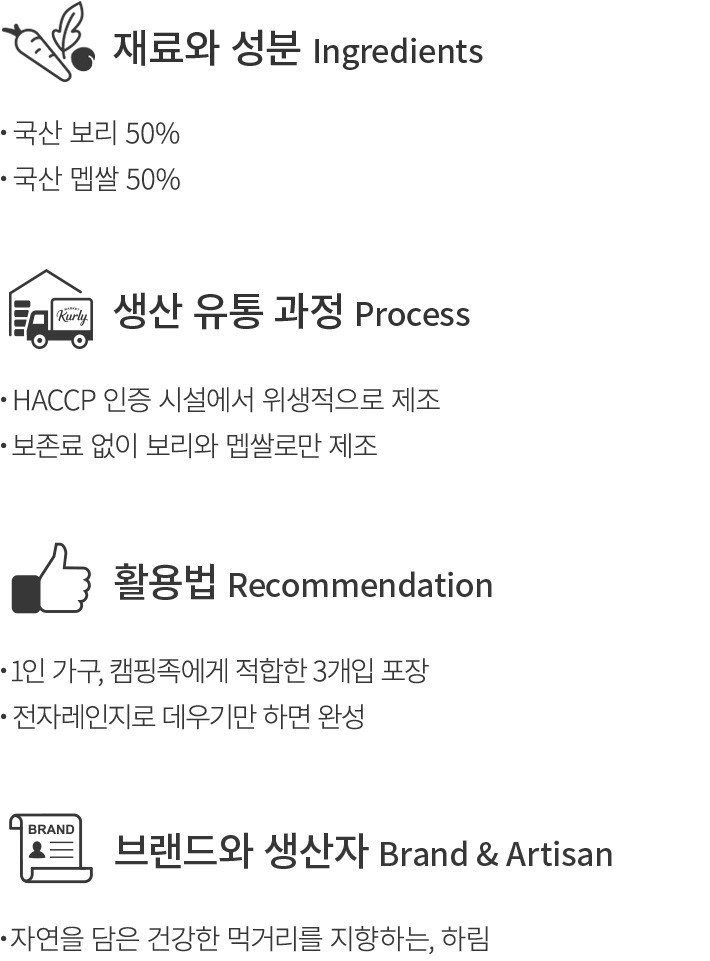 찬장 한편에 자리 잡은 즉석밥은 안도감과 든든함을 주지요. 하림의 더 미식 보리밥으로 풍미부터 식감까지 모두 챙겨 보세요. 보존료 없이 물과 보리,멥쌀로만 밥을 지어 보리와 백미 본연의 구수한 풍미를 오롯이 담았어요. 천천히 뜸을 들여,한 알 한 알 살아 있는 밥알의 식감을 잘 구현했지요. 1팩에 3개입 묶음 구성으로 준비했으니,부담 없이 선택해보세요.