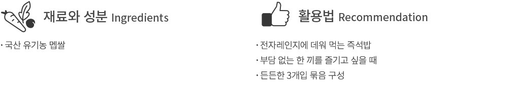 뚝딱 완성되는 간편한 즉석밥,햇반. 1인 가구나 캠핑을 즐기는 분에게는 없어서는 안 될 필수품이죠. 이번에는 국산 유기농 멥쌀을 사용해 완성한 유기농 쌀밥을 소개할게요. 부담 없는 한 끼를 즐길 수 있도록 적은 양으로 준비했답니다. 3개입 번들 구성이니,언제 어디서나 따뜻한 밥 한 끼를 즐겨 보세요. 캠핑에 챙겨 가도 좋을 거예요.