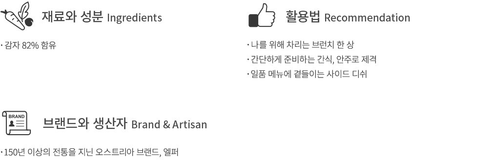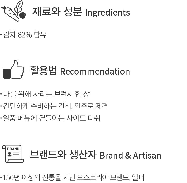 1941년부터 감자 식품을 제조해온 오스트리아 브랜드,엘퍼의 감자튀김을 소개할게요. 풍미 진한 황금빛 감자를 엄선해 고소한 맛과 향은 물론 한결 바삭한 식감을 자랑한답니다. 지금 소개하는 뢰스티 해쉬브라운 감자튀김은 길쭉한 형태로 만들어 한 손에 집고 먹기 좋은 제품이에요. 감자의 입자를 살려 두어 고유의 포슬포슬한 식감과 구수한 향미를 진하게 느낄 수 있지요. 바삭하게 튀겨 간식이나 안주,브런치 메뉴로 다채롭게 활용해 보세요.