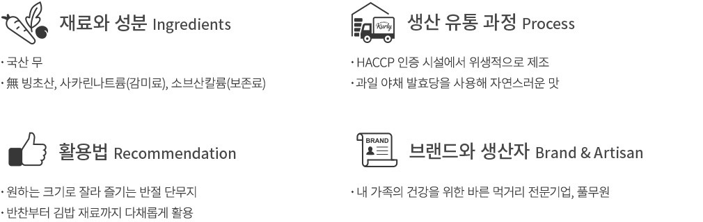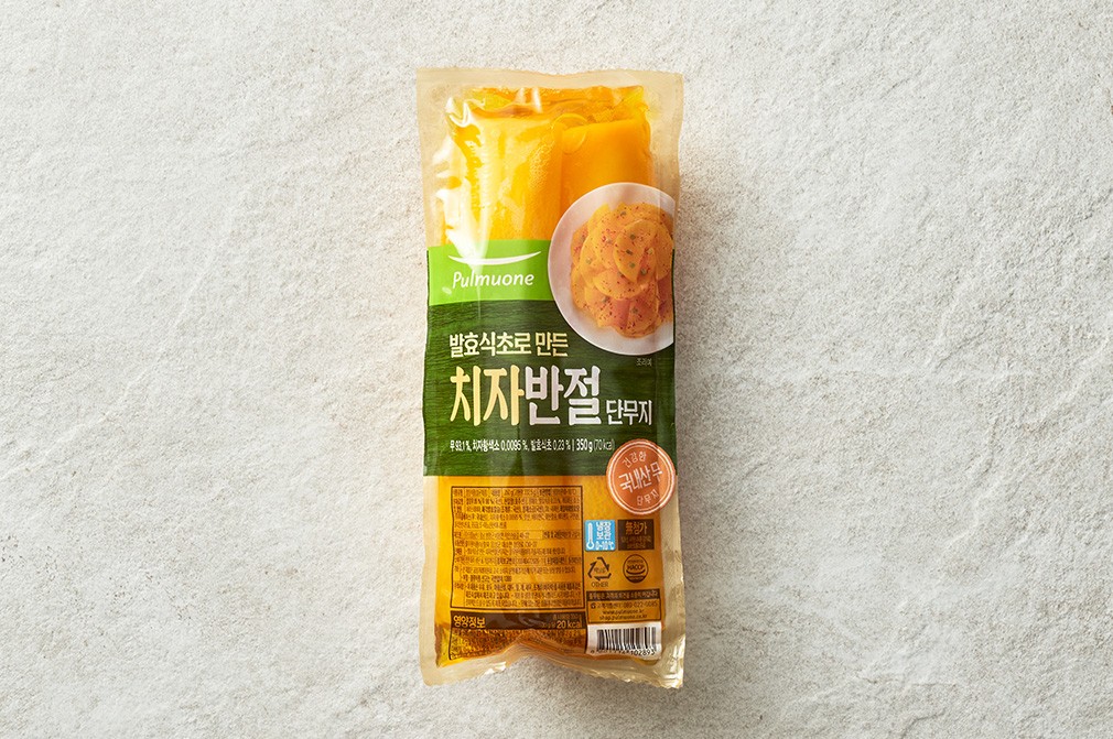 바르게 만들어 믿음이 가는 풀무원의 치자 반절 단무지를 만나 보세요. 국산 무를 발효식초에 절여 깔끔한 맛은 물론이고요. 과일 야채 발효당을 사용해 자연스러운 풍미가 특징이랍니다. 통 단무지를 반으로 길게 잘라 담았으니,원하는 두께로 송송 썰어 사용할 수 있지요. 라면이나 짜장면에 곁들이는 밑반찬부터 김밥의 속 재료까지 다채롭게 활용해 보세요.