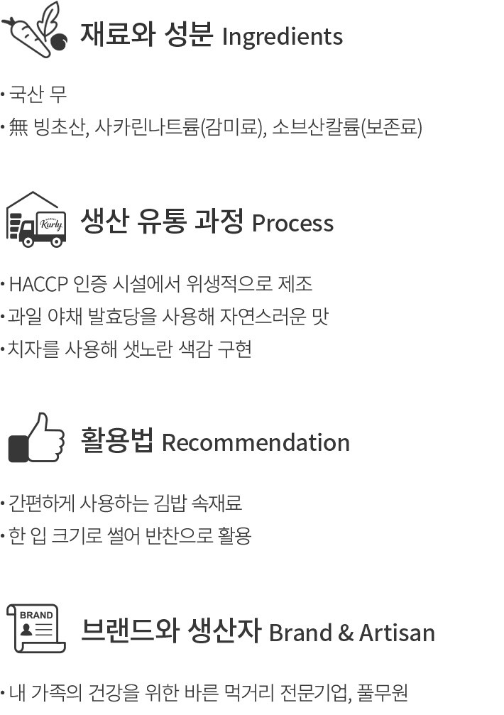 바르게 만들어 믿음이 가는 풀무원의 치자 김밥 단무지를 만나 보세요. 치자를 더해 한결 진한 노란색을 띄는 것이 특징이에요. 국산 무를 발효식초에 절여 깔끔한 맛은 물론이고요. 과일 야채 발효당을 사용해 자연스러운 풍미를 느낄 수 있답니다. 길쭉하게 잘라 담았으니 김밥에 그대로 사용할 수 있어 간편하지요. 송송 잘라 양념에 버무려주면 반찬으로도 훌륭할 거예요. 한 팩에 약 11줄이 들어 있으니 넉넉히 사용해 보세요.