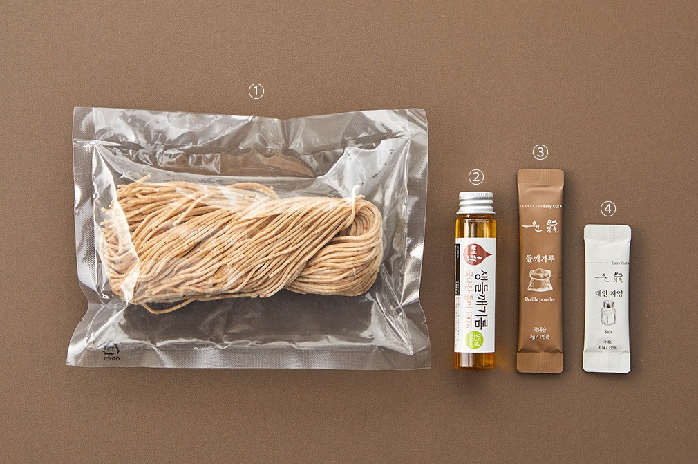 생들기름면・구성:①통밀면(130g),②생들기름(25g),③들깻묵(3g),④천일염(1.3g)