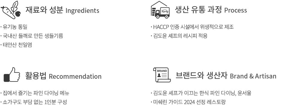 ・특징:소금과 들깻묵,생기름으로만 맛을 내 간결하고 깔끔한 매력이 돋보입니다. 국내산 들깨를 압착한 생들기름의 고소한 풍미를 오롯이 느낄 수 있어요.