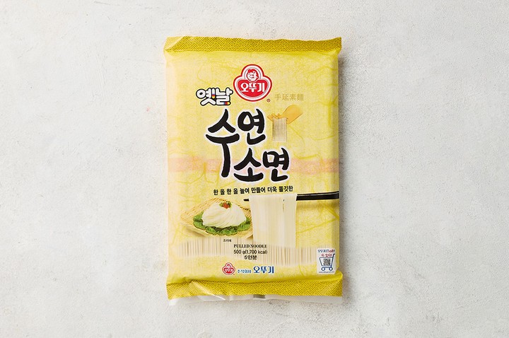 오뚜기의 옛날 국수로 다양한 종류의 국수를 만나 보세요. 이번에는 수연 소면을 소개할게요. 한 올 한 올 손으로 늘여 만드는 전통 수연 방식으로 제면하고요. 28시간 동안 8번의 숙성 과정을 거쳐 완성했답니다. 쫄깃하면서도 부드러운 식감은 물론,쉽게 퍼지지 않아 더욱 만족스러워요. 갖가지 재료를 곁들여 잔치국수,콩국수 등으로 완성해 보세요.