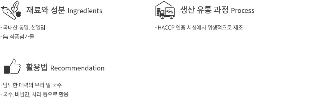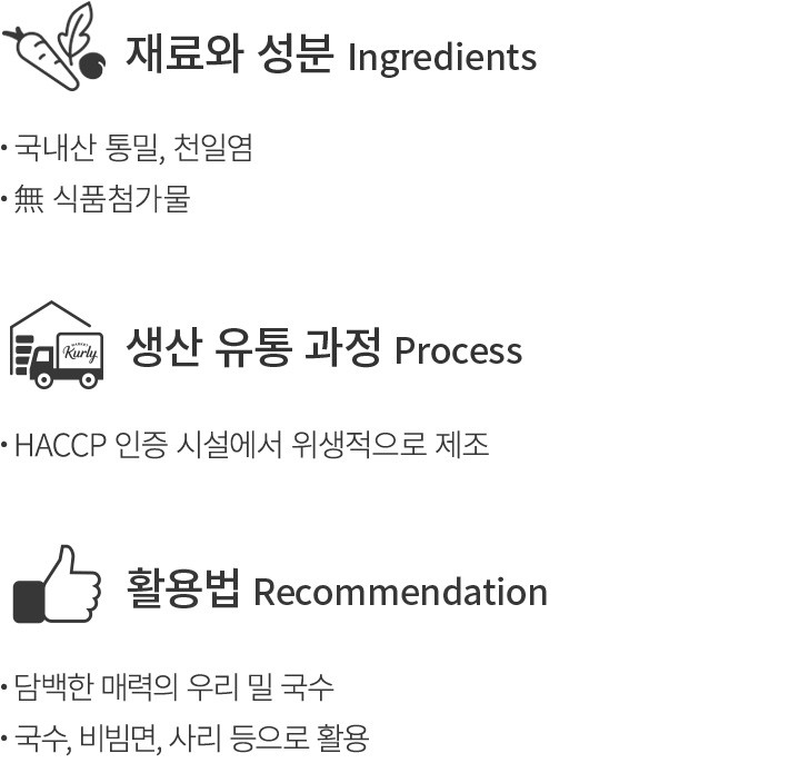 온 가족이 안심하고 먹을 수 있는 국수,우리농으로 만나보세요. 50여 년간 쌓아 온 국수 제조 노하우로 정성껏 만든 국수를 선보여요. 이번에는 우리 밀로 만든 국수를 소개할게요. 다른 첨가물 없이 밀가루와 천일염으로 만들어 더욱 믿음직스럽죠. 우리 밀 본연의 구수하고 담백한 맛은 물론이고요. 부드러우면서도 쫄깃한 식감이 살아있답니다. 국수나 사리 등으로 다양하게 활용해 보세요.