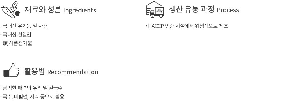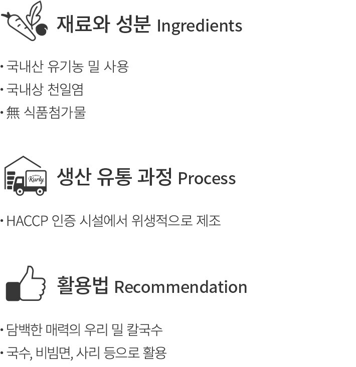 온 가족이 안심하고 먹을 수 있는 국수,우리농으로 만나보세요. 50여년간 쌓아 온 제조 노하우로 정성껏 만들었어요. 깨끗하게 길러낸 유기농 밀로 완성한 국수 면을 보여드려요. 다른 첨가물 없이 오직 밀가루와 천일염만 사용해 만들었는데요. 우리 밀 본연의 구수하고 담백한 맛,쫄깃한 식감까지 살아있답니다. 깔끔한 잔치 국수는 물론,각종 요리에 더할 사리로도 두루 사용해보세요.
