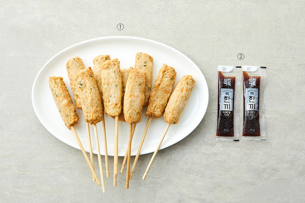 통통야채 새우봉꼬치어묵 ?구성 :①새우봉꼬치어묵(50g X 10개),②한끼 어묵탕 소스(25g X 2개)