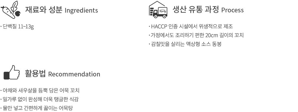 알레르기정보 | -새우봉꼬치어묵:대두,밀,새우 함유 *이 제품은 난류(가금류),메밀,땅콩,고등어,게,새우,돼지고기,닭고기,쇠고기,복숭아,토마토,호두,오징어,아황산류,조개류(굴,전복,홍합 포함)를 사용한 제품과 같은 제조시설에서 제조하고 있습니다. -어묵탕소스 *이 제품은 알류(달걀,메추리알),메밀,땅콩,잣,고등어,게,돼지고기,토마토,복숭아,아황산류,호두,닭고기,오징어,조개류(굴,전복 포함)를 사용한 제품과 같은 제조시설에서 제조하고 있습니다. |