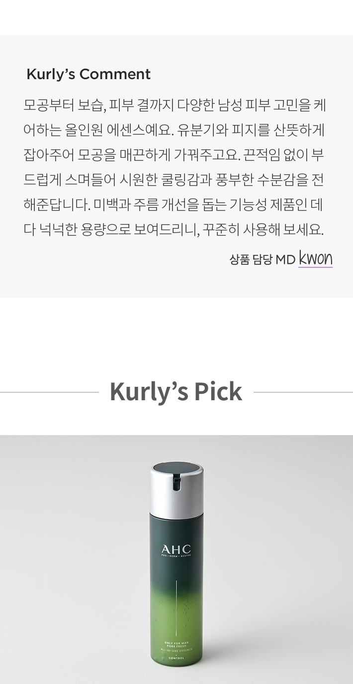 ・특징:유분기로 인한 남성 피부 고민을 복합적으로 케어하는 올인원 에센스입니다. 산뜻하고 매끈한 피부로 가꿔줘요.
