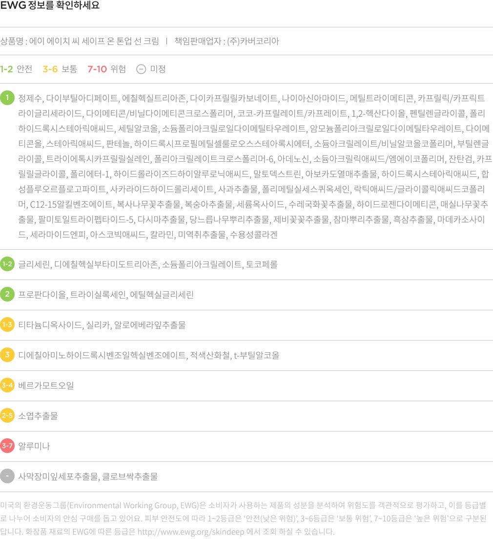 사용법・ 스킨케어 마지막 단계에 적당량을 덜어 자외선 노출이 걱정되는 부위에 골고루 펴 발라주세요.
