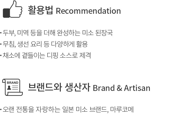 일본을 대표하는 미소 브랜드,마루코메의 시로미소를 소개할게요. 시로미소는 쌀과 대두를 2:1 비율로 담근 일본식 된장으로,기존 된장과 달리 밝은 색을 띠고 있는 것이 특징이에요. 짠맛이 적고 담백한 것은 물론,은은한 단맛을 느낄 수 있답니다. 된장국부터 전골,조림,무침 등 다양하게 활용해보세요. 순하고 부드러운 편이라 샐러드,오이 등 채소에 곁들여 드시거나 샐러드 드레싱에 섞어서 활용하기에도 좋을 거예요.