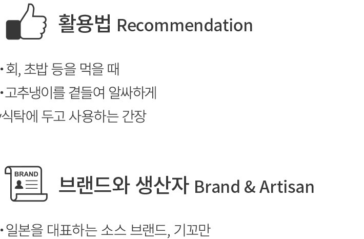 일본을 대표하는 간장 브랜드 기꼬만. 이번에는 회와 초밥을 곁들여 먹기 좋은 생 사시미 간장을 준비했어요. 열처리를 하지 않고 만든 생간장이라 가볍고 산뜻한 맛이 나지요. 음식 본연의 맛을 해치지 않으면서도 은은한 감칠맛을 더해주니 더욱 만족스러워요. 신선하게 즐기기 좋은 양만큼 담아 준비했으니,식탁에 두고 간편하게 활용해 보세요.