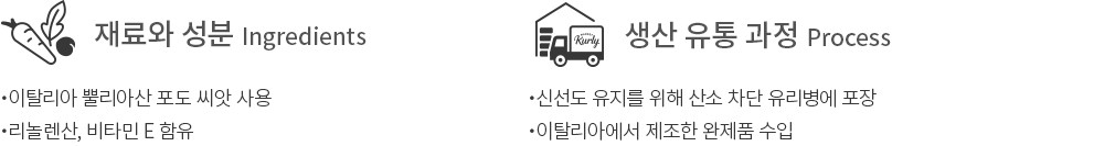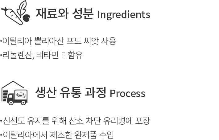 이탈리아 반도에서 가장 역사 깊은 와인 생산지로 알려진 지역,뿔리아의 포도 씨앗으로 완성한 폰타나의 포도씨유를 소개할게요. 이탈리아에서 제조한 완제품을 수입해,오일의 가장 신선한 순간이 병에 오롯이 담겨있죠. 산소를 차단하는 유리병에 담은 덕에 본연의 향미와 신선함을 그대로 지니고 있답니다. 포도씨유는 발연점이 높아 튀김,부침 요리에도 알맞고,온도가 높아도 잘 타지 않아요. 어떤 요리에든 두루 활용해보세요.