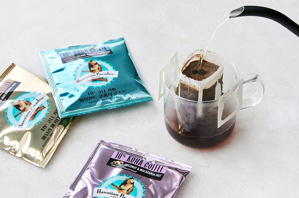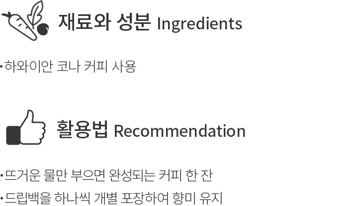 ・특징:부드러운 코나 커피에 코코넛과 구운 마카다미아 향을 더해 완성한 드립백입니다. 달콤한 풍미가 진하게 느껴져요.