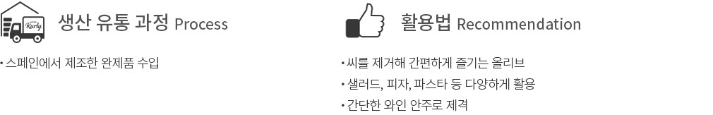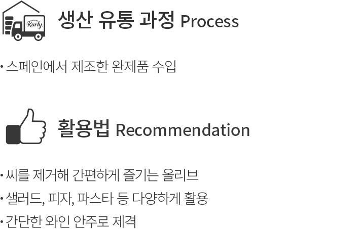 ・특징:잘 익은 블랙올리브를 산뜻하게 절여 한 병에 담았습니다. 쫄깃한 맛과 특유의 풍미를 즐길 수 있어요.