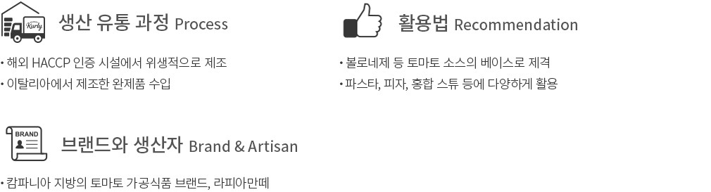 | 중량/용량 | 파사타 토마토 퓨레:690g,파사타 바질 토마토 퓨레:680g |