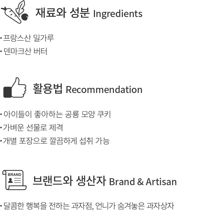 귀엽고 깜찍한 과자로 사랑받는 과자점,언니가 숨겨놓은 과자상자의 공룡 쿠키세트를 만나 보세요. 프랑스산 밀가루와 덴마크산 버터,국산 계란 등 까다롭게 엄선한 재료로 만든 버터 쿠키를 담았는데요. 다양한 모양의 공룡 쿠키 사이에 조그만 화석 초콜릿들이 숨어있어 더욱 사랑스럽답니다. 깔끔하게 포장하여 보내드리니 달콤한 행복을 맛보고 싶은 분이나 아이를 위한 간식 선물을 찾고 계신 분에게 추천해 드릴게요.