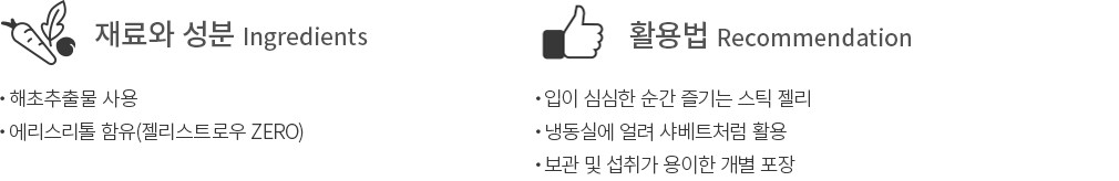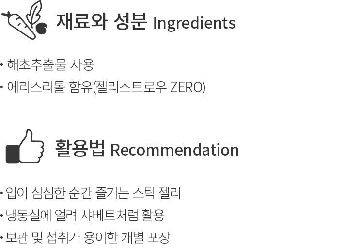 ・특징:에리스리톨로 자연스러운 단맛을 더한 스틱 젤리예요. 복숭아,딸기,블루베리,레몬 4가지 맛으로 구성했답니다.