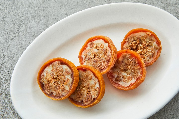 특유의 쫀득함과 녹진한 감칠맛을 자랑하는 곶감은 어른과 아이 할 것 없이 즐기기 좋은 간식인데요. 이번에는 크림치즈와 그래놀라로 속을 가득 채운 곶감을 소개할게요. 진득한 달콤함이 일품인 옥천 준시 곶감과 산뜻한 크림치즈가 조화롭게 어우러지고요. 귀리와 아몬드로 만든 그래놀라가 중간 중간 씹혀 재미난 식감을 더해주지요. 차나 와인과 함께 곁들여 즐겨 보세요. 어여쁜 비주얼 덕에 손님을 위한 다과상에도 제격일 거예요.