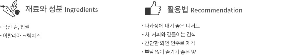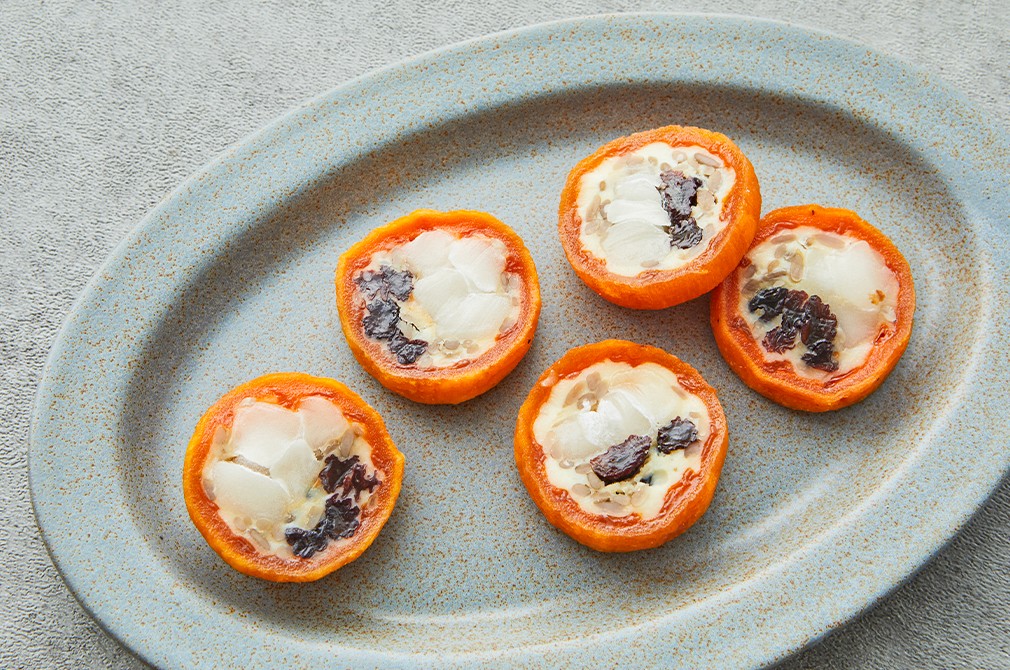 특유의 쫀득함과 녹진한 감칠맛을 자랑하는 곶감은 어른과 아이 할 것 없이 즐기기 좋은 간식인데요. 이번에는 크림치즈와 떡으로 속을 가득 채운 곶감을 소개할게요. 곶감 중에서도 당도 높은 옥천 준시를 사용해 진득한 달콤함이 돋보이는데요. 사이사이 쫄깃한 떡과 건포도가 씹히며 재미난 식감을 더해주지요. 차나 와인을 마실 때 곁들여도 좋고요. 손님을 위한 다과상에도 제격일 거예요. 한 번에 먹기 좋은 양으로 준비했으니,부담 없이 담아보세요.