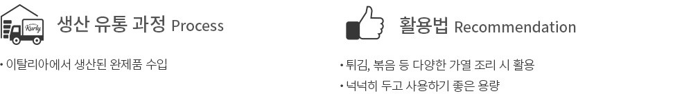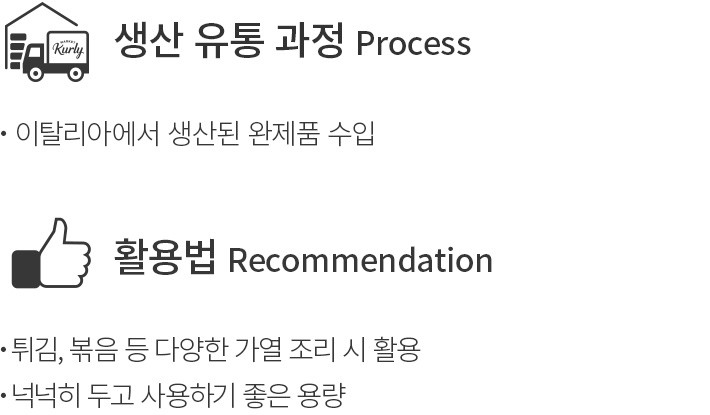 ・특징:정제 올리브유와 엑스트라버진 올리브유를 각각 90%,10% 혼합해 담은 오일입니다. 은은하게 느껴지는 과실향과 올리브의 향미가 잘 살아 있어,요리에 활용하면 신선한 맛과 고소함을 더해 줘요.