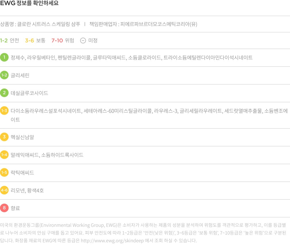 ・ 특징:두피의 유분기와 노폐물을 개운하게 클렌징해줘요. 산뜻한 시트러스 향입니다.