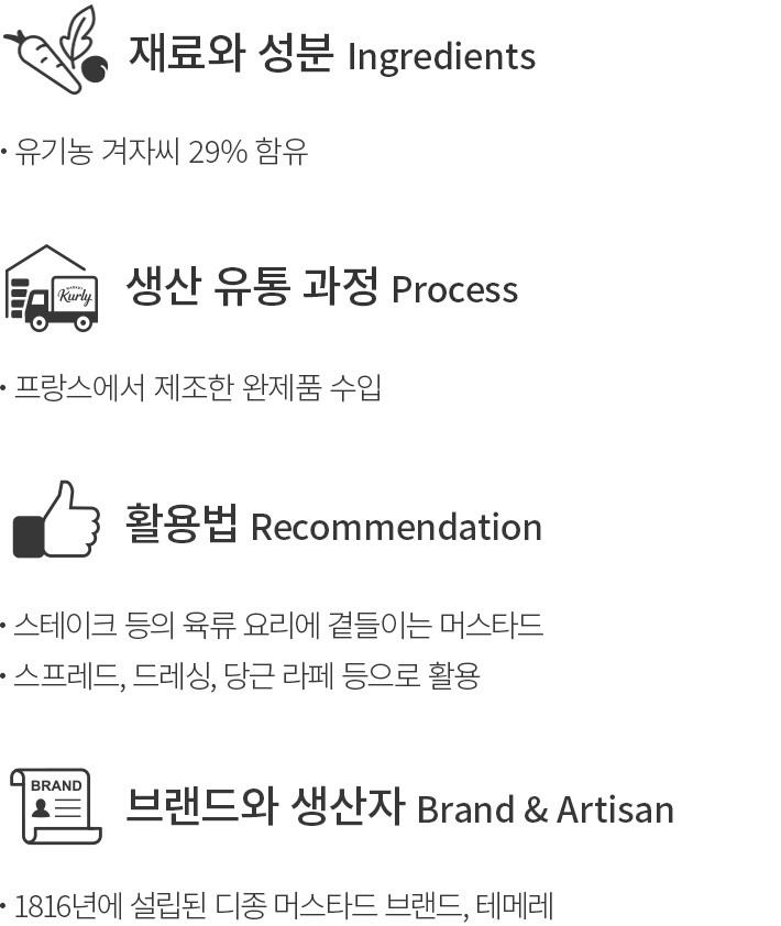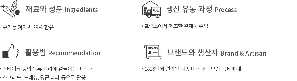 1816년에 설립된 프랑스 디종 지역의 머스타드 브랜드,테메레의 유기농 홀그레인 머스타드를 만나 보세요. 머스타드가 톡톡 씹힐수록 살짝 매콤하면서도 새콤달콤한 맛이 느껴진답니다. 스테이크 등의 육류 요리에 곁들여 즐겨 보세요.