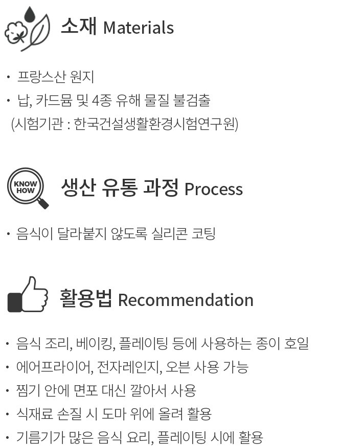 ? 특징:원형으로 재단된 종이 호일입니다. 프라이팬 조리 시 활용하면 음식이 눌어붙거나 타는 것을 막아주고,남은 음식물을 간편하게 처리할 수 있어요.