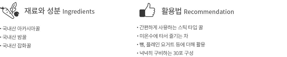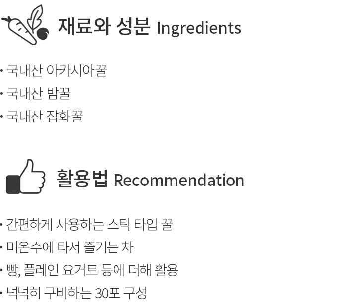 | 중량/용량 | 10g x 30EA (아카시아/잡화/밤꿀 각 10EA) |