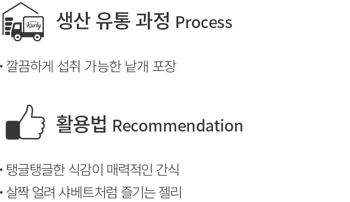 ・특징:4가지 맛의 젤리를 다양하게 즐길 수 있는 구성입니다. 그대로 드시거나 살짝 얼려서 시원하게 즐겨 보세요.