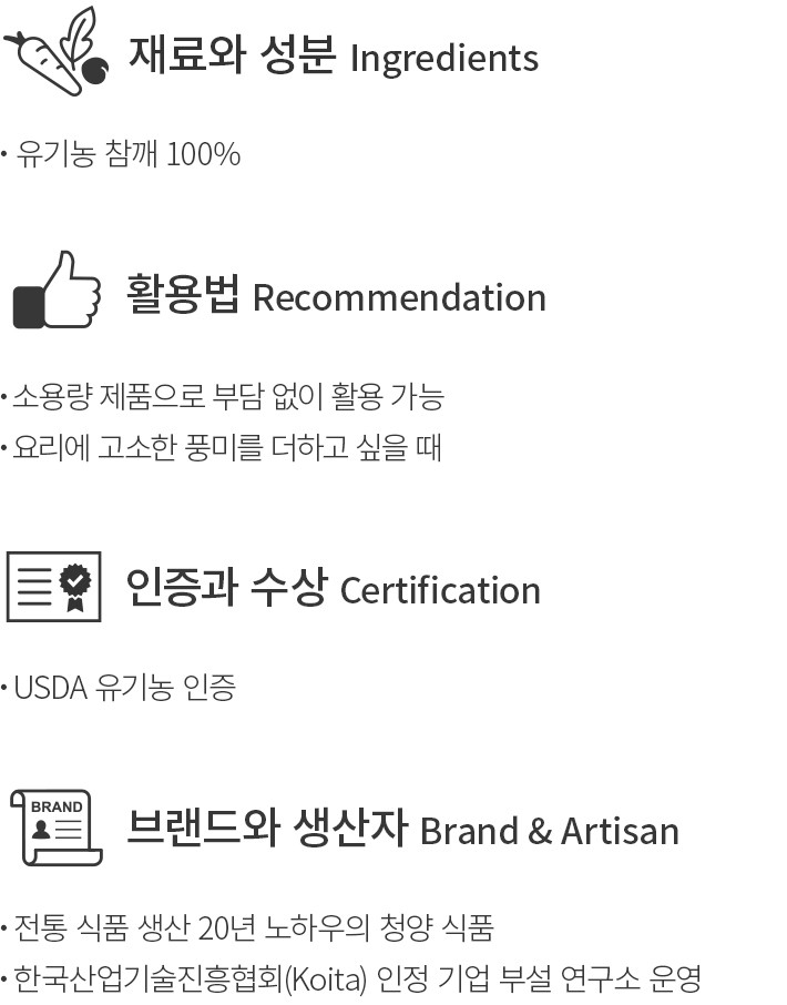 꼼꼼히 엄선한 유기농 참깨만으로 깨끗하게 만든 청양의 유기농 볶음 통 참깨를 만나 보세요. 최적의 온도에서 제대로 볶아 참깨 본연의 고소한 풍미가 잘 살아있답니다. 요리의 모양새를 살리고 고소한 매력을 더하고 싶을 때 활용해 보세요.